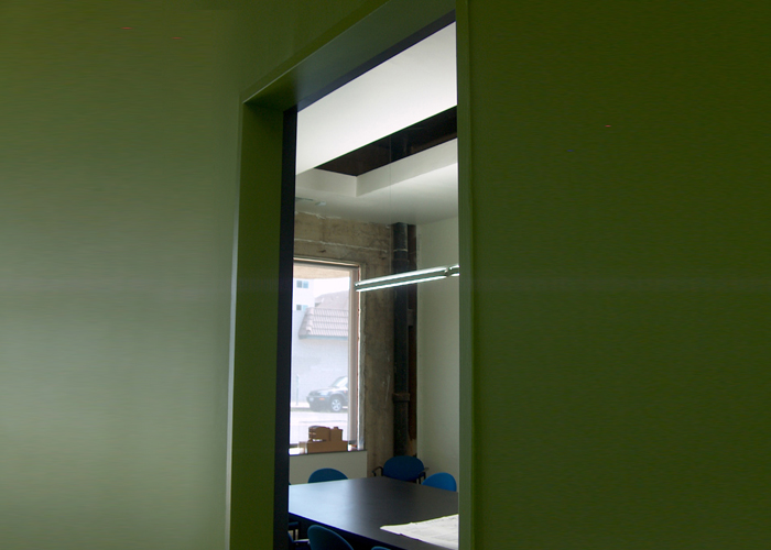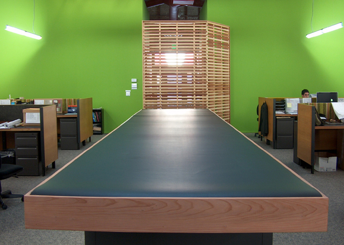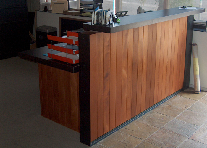 Demolition, interior framing, tile flooring, drywall installation, door installation, custom receptionist desk, redwood lath finish wall surface, Homasote wall finish and custom work table. |