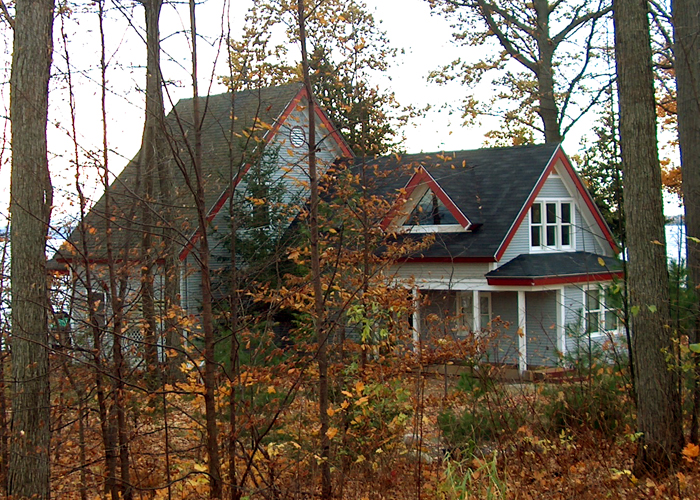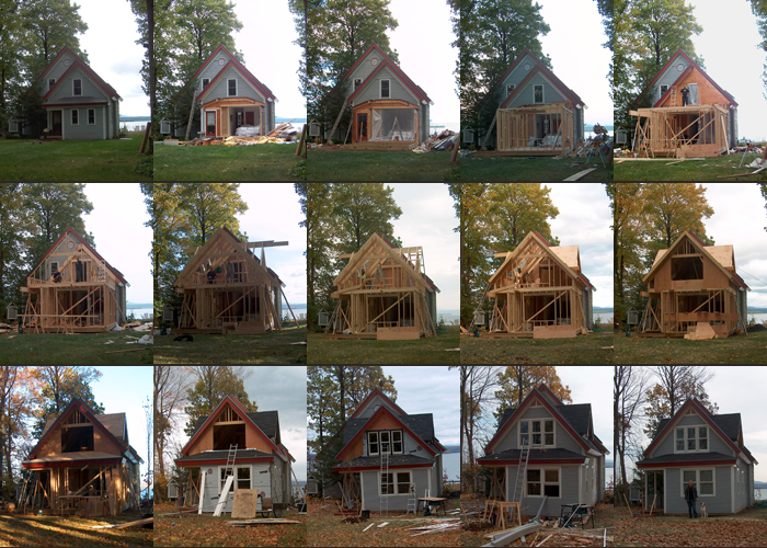 Design, poured concrete pier footings, wood framing, cedar siding, shingle roofing, hand-milled maple flooring from trees on site, wooden windows and doors, wooden interior and exterior trim and detailing. |