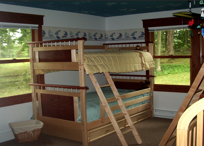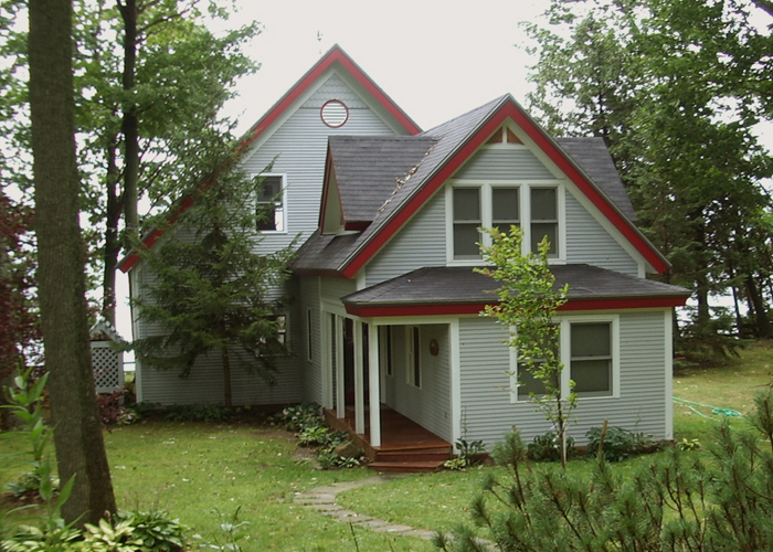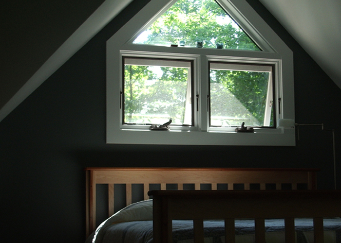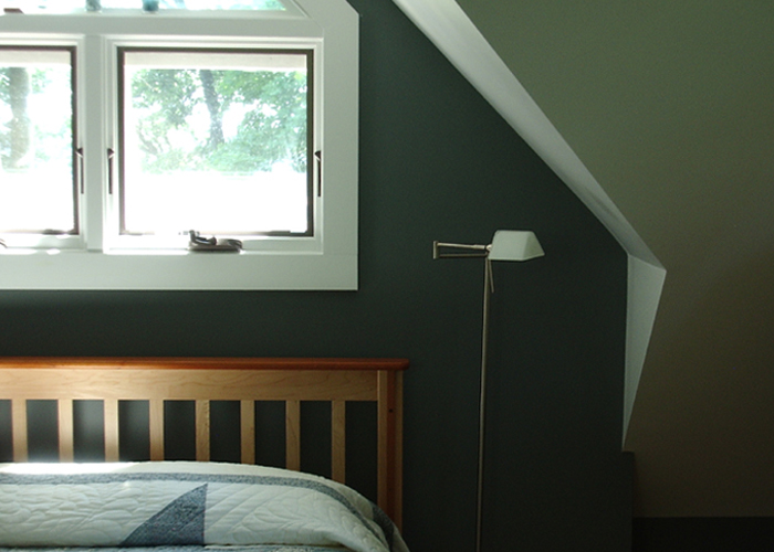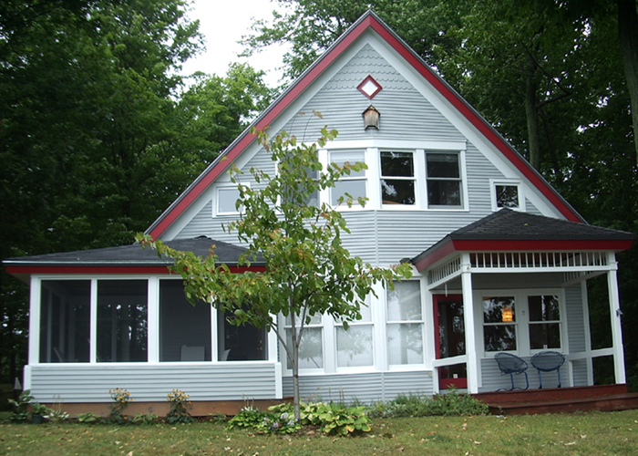 A 600 sq ft, two-story addition to an existing two-bedroom lakeside house. Additional square footage includes two new bedrooms and a screened-in porch. |